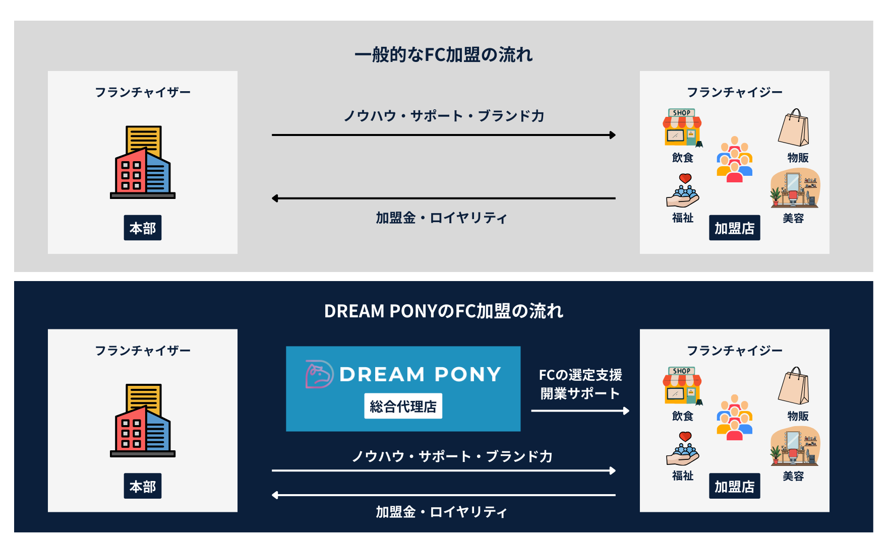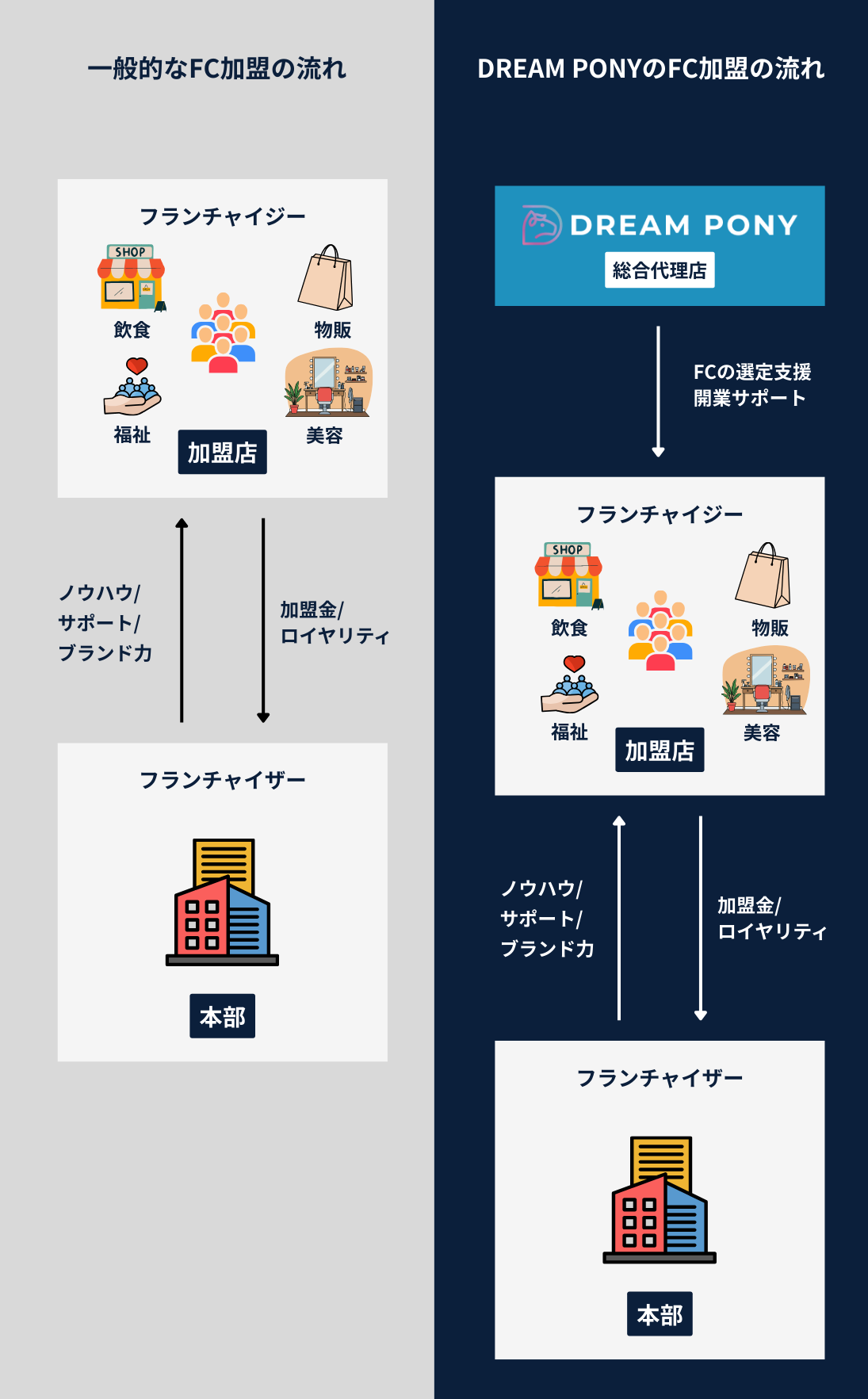 一方、DREAM PONYでは、その間に総合代理店として入ることで、加盟希望者に対してFC本部の紹介だけでなく、業種選定の支援や開業に向けたサポートまで行います。